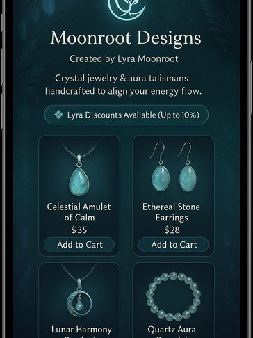 Tap a store, like Moonroot Designs, to explore their handcrafted creations infused with meaning and intention. View products up close, learn their energetic purpose, and use your Lyra to unlock discounts and creator bonuses. Lyra doesn’t buy items — it enhances your energy and rewards you for being active in the world.