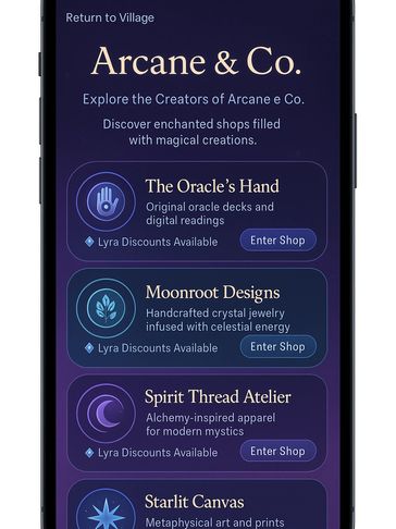 When you open Arcane & Co., you’ll see a list of creator shops, each with their own energy and style. Tap “Enter Shop” to step into their boutique, explore their creations, learn the story behind their work, and use your Lyra to unlock special discounts and rewards.