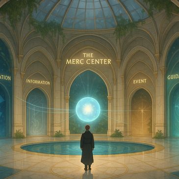 Beneath a glass dome where starlight meets reflection, The Merc Center hums with living intelligence. Four great archways glow. Education, Information, Event, and Guidance — each a gateway to knowledge shaped by light itself. At the heart of the hall hovers "The Keeper", a radiant sphere of sentient energy that whispers daily insights to all who seek. Within its luminous current, the mysteries of Lucidium unfold — revealing direction, upcoming gatherings, and the wisdom of The Merc Library. Here, thought becomes light, and light becomes knowing.