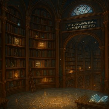 Hidden within the heart of the Merc Center lies the Library, where knowledge hums softly through rows of ancient tomes and living manuscripts. Each book glows faintly with stored light — whispering wisdom from the ages of Lucidium to any who dare open their pages. The air itself feels enchanted, alive with murmurs of teachings long preserved. Here, seekers come not just to read, but to remember — to awaken forgotten truths, explore the foundations of metaphysical education, and uncover the mysteries that guide every realm of Lucidium. Within these shelves, light is language, and wisdom is eternal.